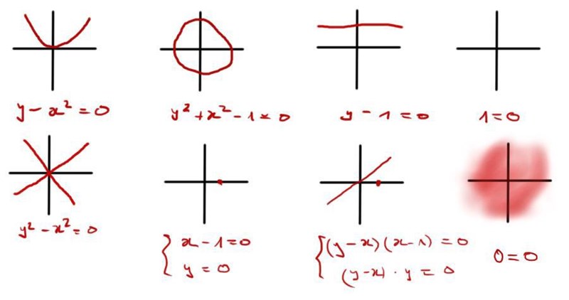 - Om kroppen vi jobbar över är algebraiskt sluten (till exempel ) så kommer Zariski-topologin på att vara intimt sammankopplad med den algebraiska strukturen hos ringen av alla polynom över i stycken variabler. Det precisa påståendet kallas för Hilberts Nullstellensatz, och handlar om polynomringens så kallade radikala ideal (ett av många exempel på hur algebraisk terminologi låter jättepolitiskt!).