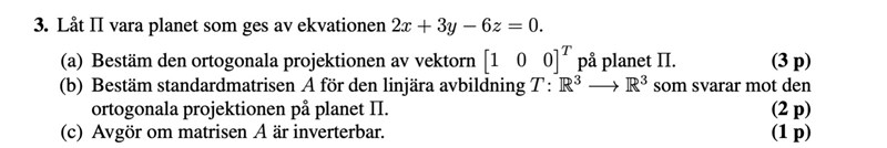 Att en matris är inverterbar är ekvivalent med att bara har triviallösningen . Men det finns alltså ett annat som löser ekvationen i det här fallet, nämligen planets normalvektor. Alltså är matrisen inte inverterbar.