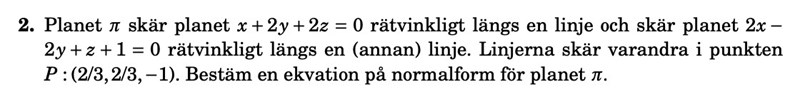 Uppgiften är lite svajigt formulerad, men jag tolkar det som att normalen till planet är vinkelrät mot såväl normalen till som normalen till .