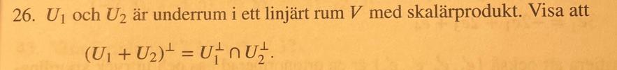 Du börjar bra. Antag att z ligger i (U1 + U2). z är då ortogonal mot varje vektor i (U1 + U2). Eftersom U1 är en delmängd av (U1+U2) så är z ortogonal mot varje vektor i U1, dvs z ligger i U1. På samma sätt inser vi att z ligger i U2. Således ligger z både i U1 och U2. Dvs vi har att .