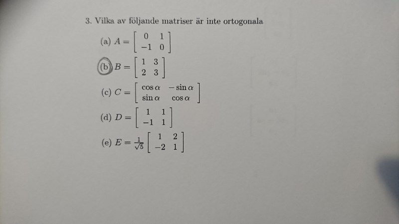 I facit står det b och d eftersom att deras kolonvektirer inte bildar en ortonormal mängd. Vad innebär det?