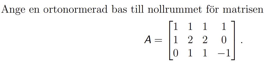 Jag kom fram till att en bas för nollrummet är (-2,1,0,1) och (0,-1,1,0) (efter gausselimination med Ax=0 och kom fram till s(-2,1,0,1) + t(0,-1,1,0)). Det jag inte fattar är hur man får fram den ortonormerade basen. Jag fattar att man normerar (0,-1,1,0) och får (0,-1,1,0) men hur kommer man fram till den andra vektor? Jag försökte att ta skalärprodukten mellan (-2,1,0,1) och (0,-1,1,0) vilket blev -1 så de är inte ortogonala, så därför kan jag inte normera (-2,1,0,1) och komma fram till den andra vektorn, eller?