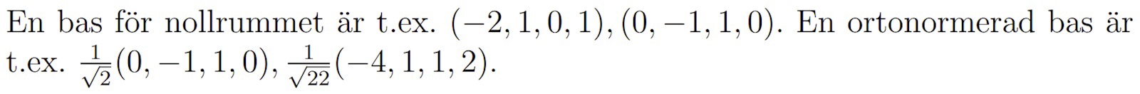 Tittar man på (-2,1,0,1) och (0,-1,1,0) kan man efter ett tag kanske inse att 2 * (-2,1,0,1) + 1 * (0,-1,1,0) = (-4,1,1,2) har samma värde i position 2 och position 3. Och efter det är det bara att normera de två vektorerna.