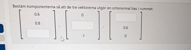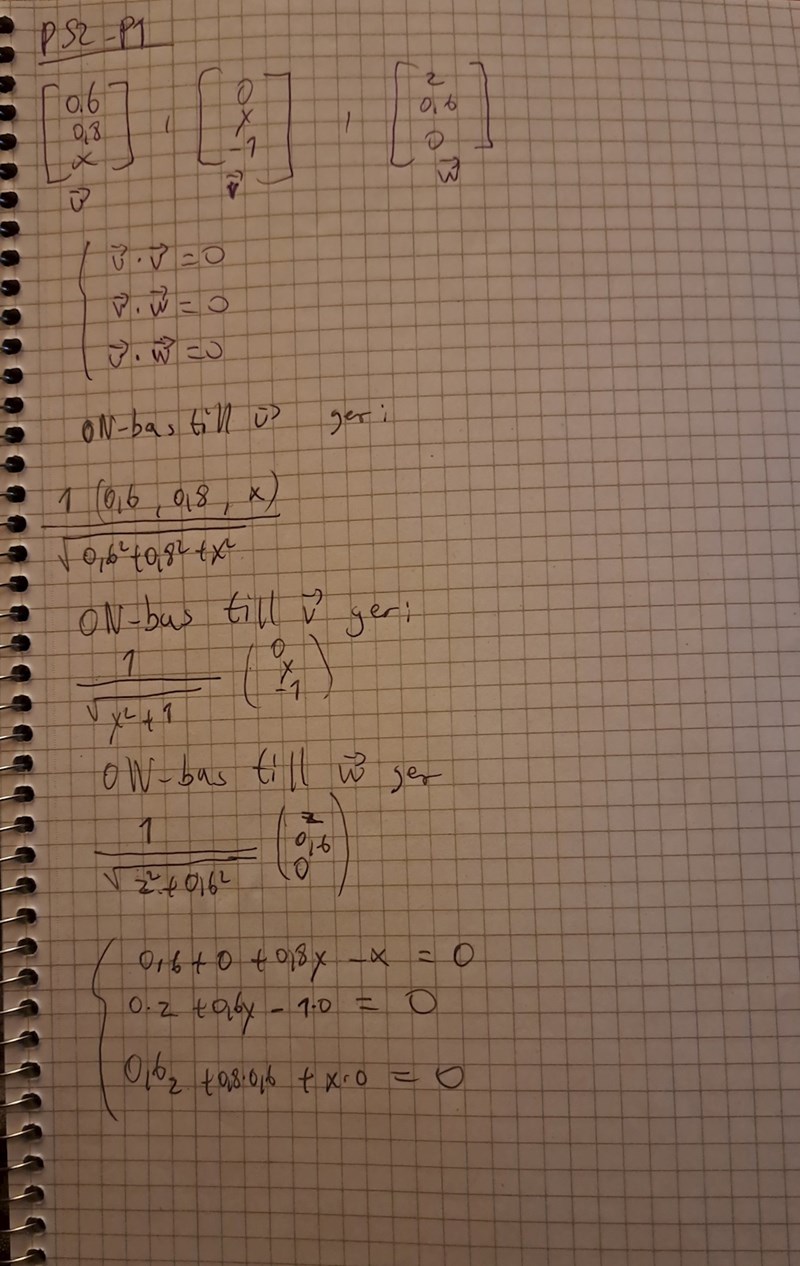 Jag vet att de tre vektorerna ska vara ortgonala för att de ska bilda ortonormal bas. Denna tanke har jag typ skrivit ned här. Jag antar man ska normera var och en av dessa vektorer och sen skriva på matrisform för att sen gauseleminiera dvs hitta x,y och z som söks?