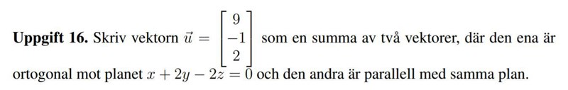 Förstår att den vektor som är ortogonal mot planet är 12-2 men hur ska jag göra för att endast 'dra' av den del som är ortogonal mot planet från vektorn u