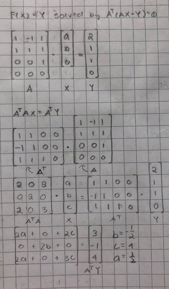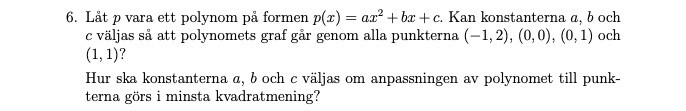 Borde inte rad fyra i matrisen A vara [0, 0, 1]? p(0)=0a+0b+1c=1p(0)=0a+0b+1c=1