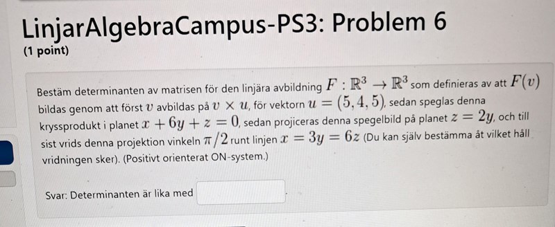 matsC skrev:Ett sätt vore att skapa matriserna för varje deltransformation och sen multiplicera ihop dem och beräkna determinanten. Värderingen 1 point får mig att misstänka att det finns en genare väg som jag inte ser.