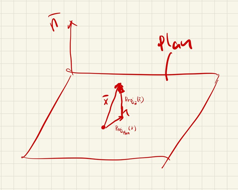 Projn projicerar en vektor på normalvektorn n till planet. Det ger en vektor parallell med n och således vinkelrät mot planet.