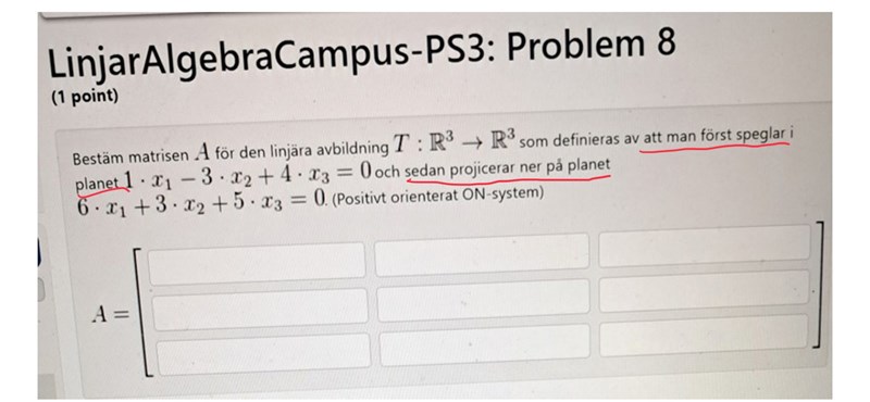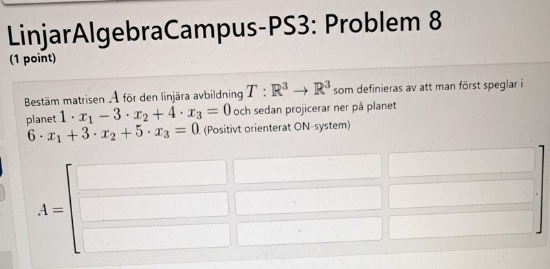 PATENTERAMERA skrev:Ja, men enklast är nog om man kan först beräknar matrisen för speglingen och matrisen för projektionen och sedan får totala matrisen genom matrismultiplikation.
