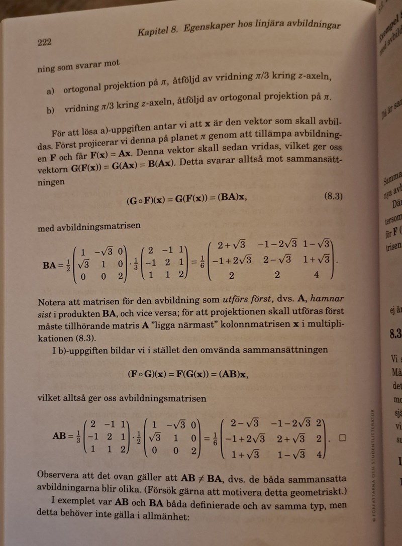 Aa okej så det blir två linjära avbildningar eftersom det blir först en spegling i ett plan och sen den spegligen blir projicerad i ett nytt plan? Och formeln ges då av den jag har bild på dvs avbildningsmatrisen=BA och ej AB ? Så anledningen till att man skriver BA är för att man hade T(x)=Ax =Bp*As*x? Bp(matrisen för projektion) och As(speglingsmatris)