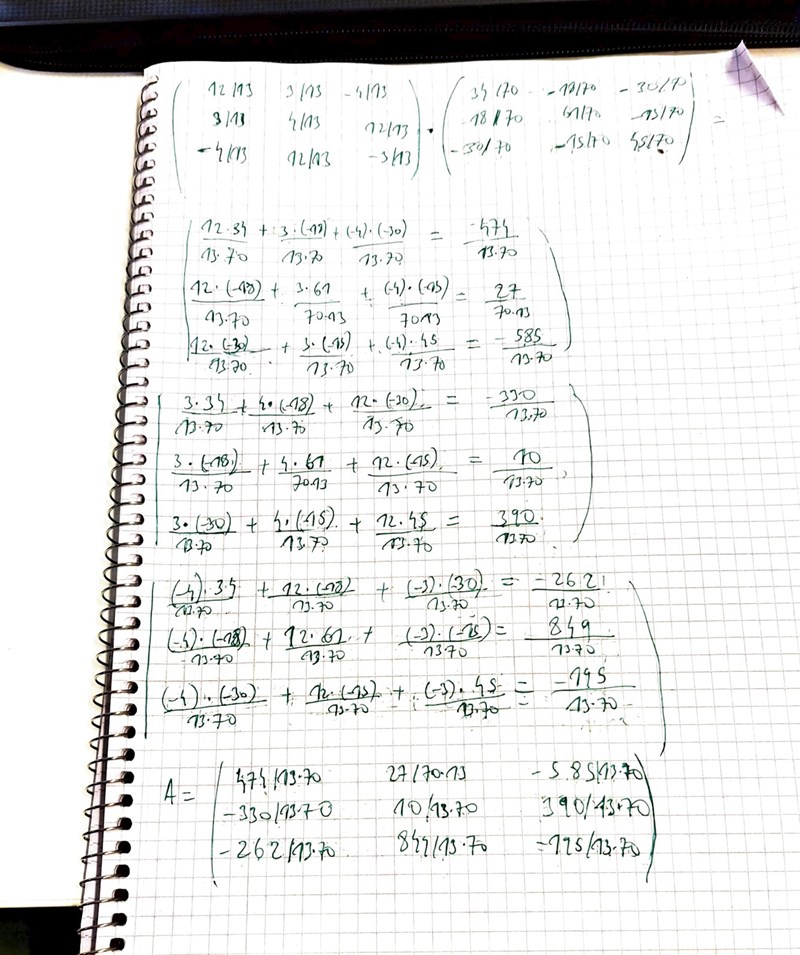 Vi kan nu se hela processen - spegling följt av projektion - som att vektorn x multipliceras med matrisen BA, vilket således kan ses som matrisen för den sammansatta avbildningen T i problemtexten. Notera att problemtexten kallar matrisen till T för A, så vi får inte blanda i hop det med vad vi här kallar A.