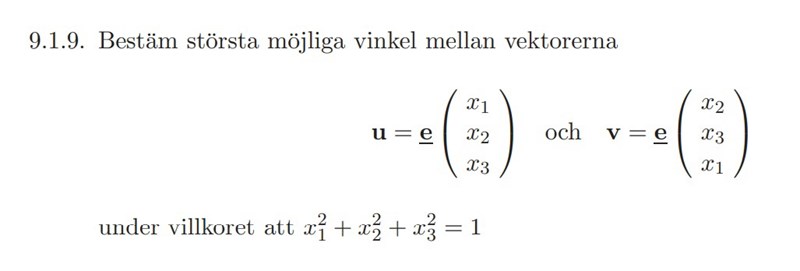 Eftersom skalärprodukten pga ska vi alltså finna minimum av under villkoret