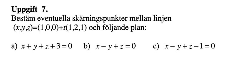 När man beräknar möjliga värden för t får man -1 för a), inga lösningar för b och 0 = 0 för c).