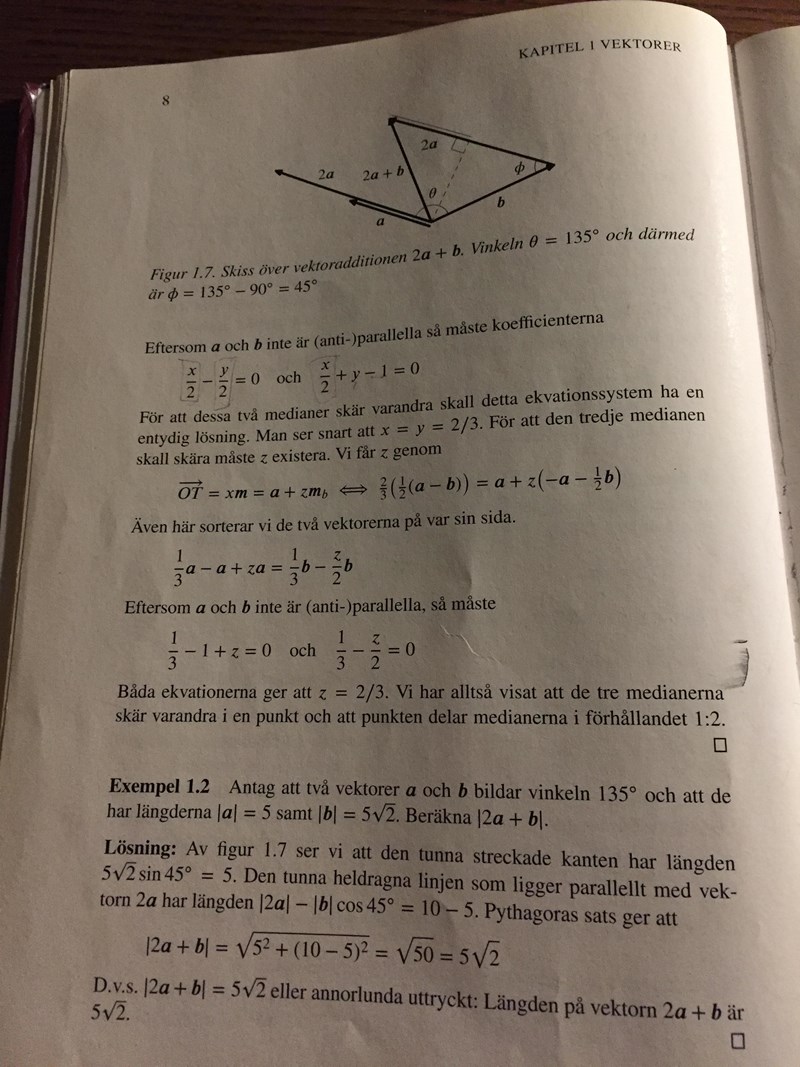 ja, om de hade varit parallella eller anti parallella så skulle de inte kunna forma en triangel, det förstår jag. okej. det måste finnas en vinkel mellan vektorerna, det förstår jag också för om de inte finns det så kan det inte bli en triangel men är det enda anledningen till att du nämner det med vinklar? för att de arnars inte kan bli en triangel av vektorerna, eller menar du något annat? resten förstår jag inte hur det kopplas ihop med texten i boken.