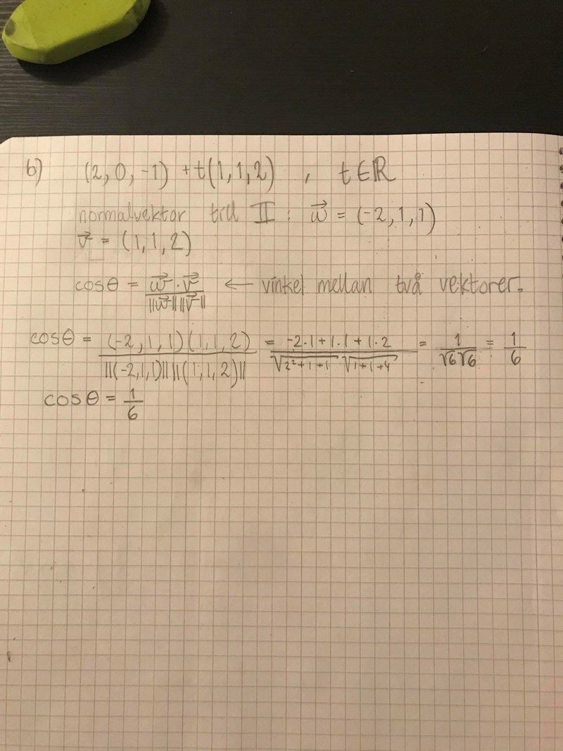 är mitt svar tillräckligt på b)? Det jag räknat ut dvs cosx=1/6 är det den totala vinkeln mellan vektorerna? Hur får jag ut den vinkel som är mindre än pi/2 dock?