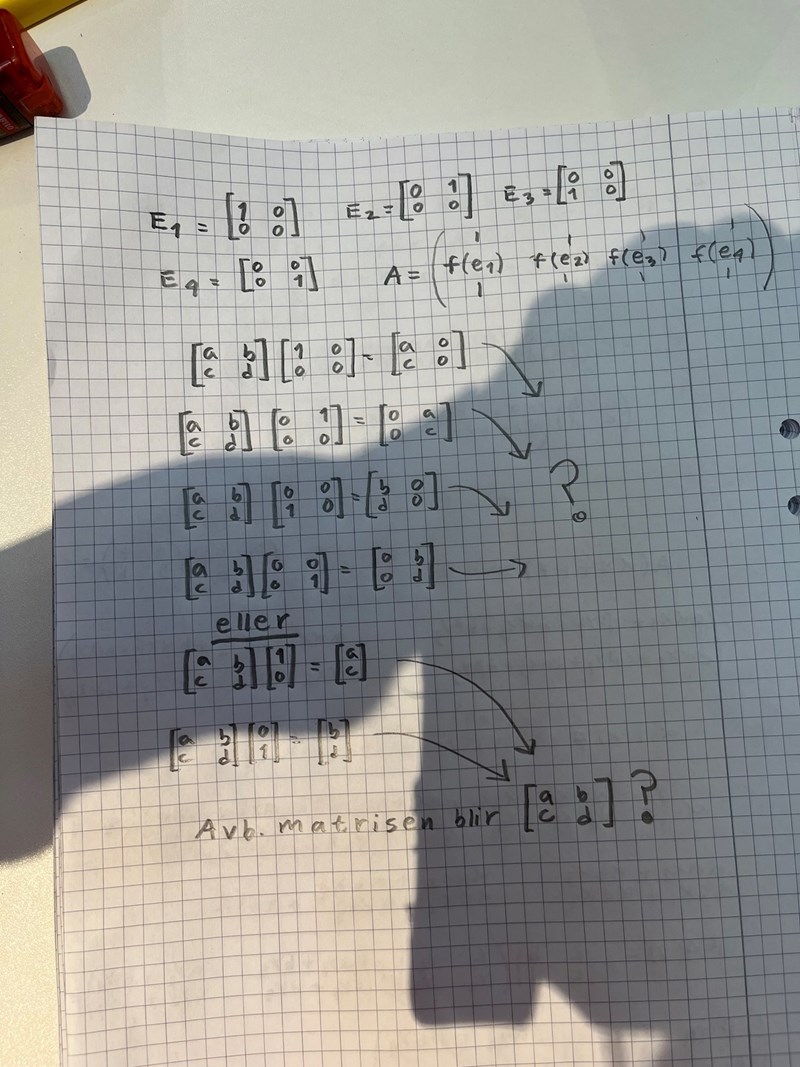 Varför gavs då de fyra matrisena som bas i uppgiften? Jag försökte avbilda "basmatrisena" men förstår inte hur jag ska tolka det, hur de avbildningarna ska kunna utgöra avbildningsmatrisen.