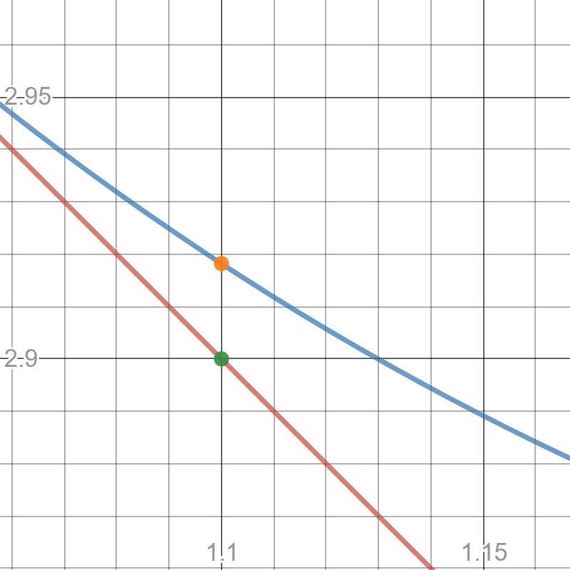 Eftersom att tangentens ekvation tydligen är den "linjära approximationen" så menar dom i uppgift b) att man ska ta hjälp av den ekvationen för att jämföra funktionsvärdet då man har x=1,1 Jag gjorde det och fick en skillnad på 0,018 eller 0,02