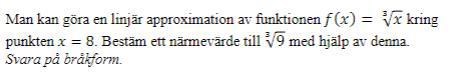 Som Matsva sa. Det är ju du vill approximera, eftersom det är svårt att beräkna exakt. Därför har du nu en linje, som går nära kurvan . Så istället för att sätta in 9 i rotfunktionen, vilket skulle ge det exakta värdet, sätter du in 9 i linjens ekvation, som ger ett ungefärligt.