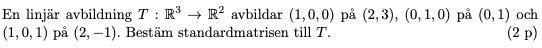 Avbildningsmatrisens kolonner är avbildningarna av respektive basvektor för en linjär avbildning. Du har avbildningarna för två av basvektorerna. För den tredje får du använda avbildningens linearitet.