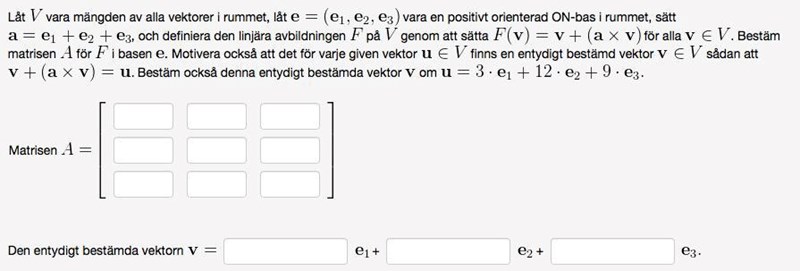 Jag har förstått att man får ut matrisen A genom att sätta in e1 , e2 och e3 i F(v)=v+(a x v) och har gjort det och kommit fram hit