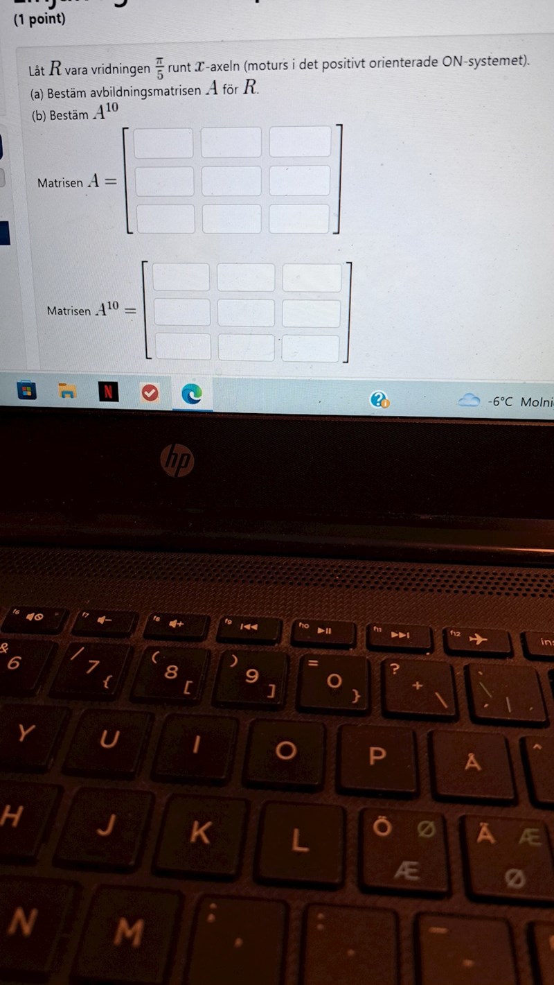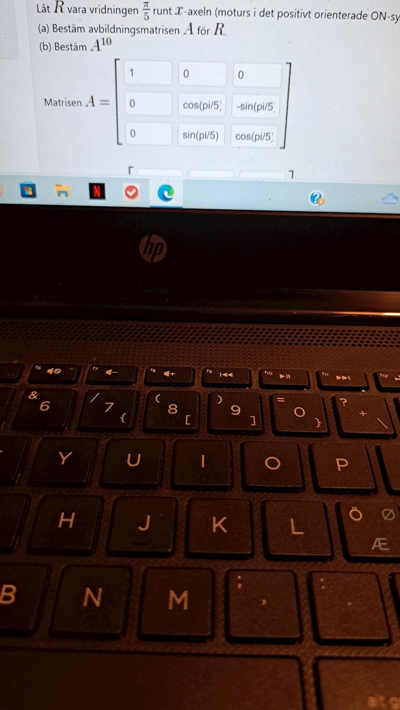Jag förstår ej riktigt vad man menar med pi/5 vridning med x axeln samt hur jag sen ska få ut A^10. Varför är det en 3×3 gånger matris och hur vet man det?