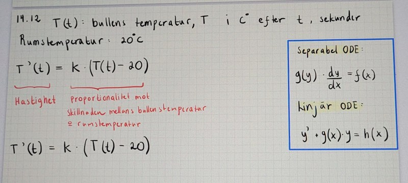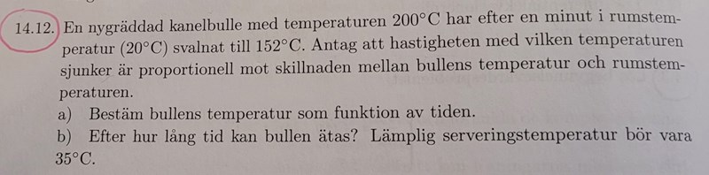 Läs uppgiften. Det står att hastigheten med vilken temperaturen sjunker är proportionell mot skillnaden mellan bullens temperatur och rumstemperaturen, d v s mot T-20.
