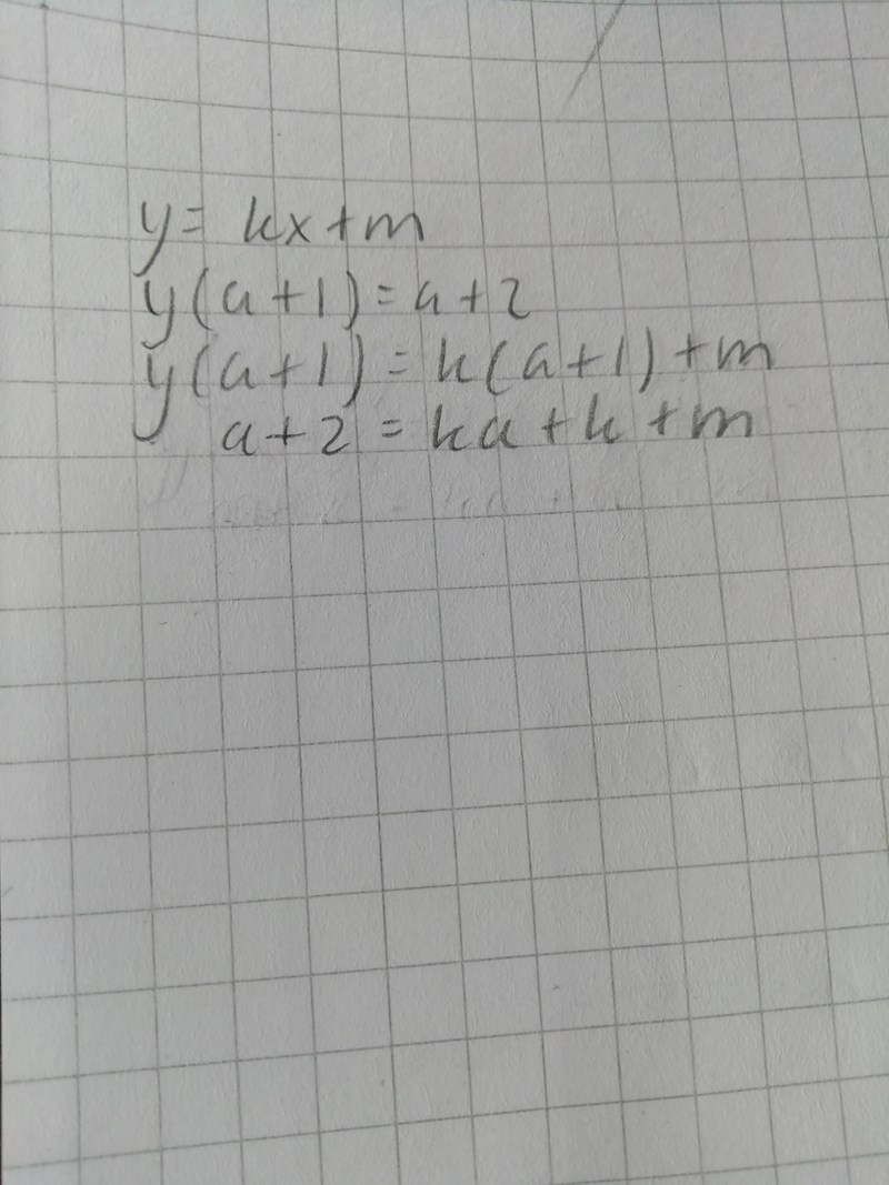 y=kx+m är din prototyp för en linjär funktion. Men du skrev den på formen y=ax+b, sedan blandar du ihop det med det a som är angivet i uppgiften och allt blir totmatsås.