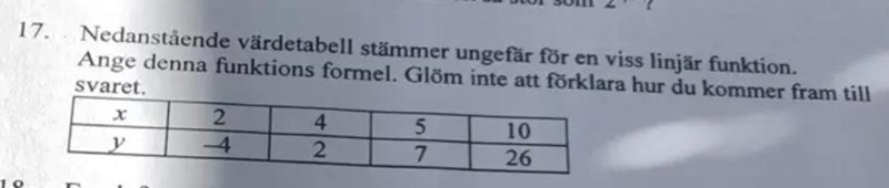 Det står i uppgiften att värdena stämmer ungefär. Det kan vara fråga om mätvärden som inte är exakta. Din uppgift är att dra den linje som bäst verkar visa funktionen. Den behöver inte gå genom någon av punkterna i tabellen, men ska gå så nära alla punkterna som möjligt. Sedan väljer du punkter på linjen för att bestämma funktionens formel.