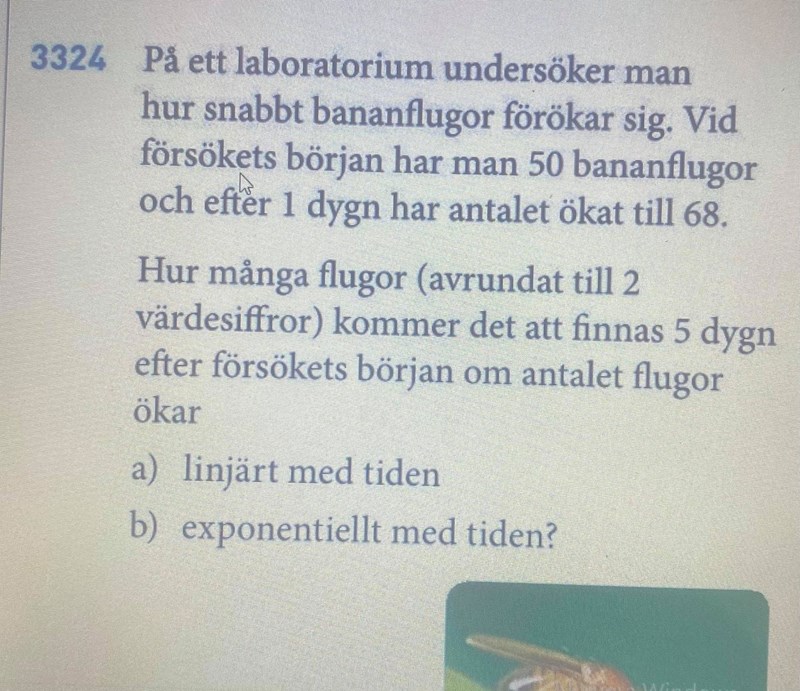 antalet flugor ökar med 18 efter 1 dygn, alltså kan vi säga att antalet flugor ökar linjärt med 18x där x=dygn.