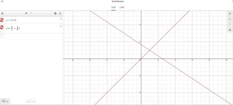 För x=1 blir y=+5/3 - 2/3 = 3/3 = 1 och punkten (1,1)Andra linien den blåa i bilden. Linierna korsas vid (1,1)