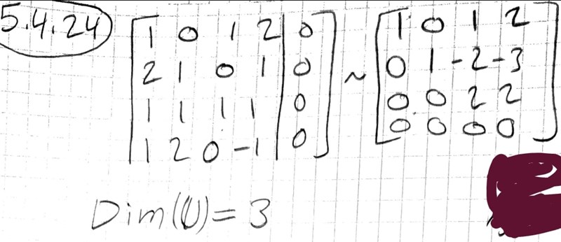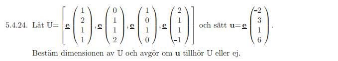 Om u är en vektor i U betyder det att du kan skriva u som en linjärkombination av de vektorer du bestämt dig för att behålla (de är bas för U, och alla vektorer i U är en linjärkombination av basvektorerna). Så, du kan lösa ekvationssystemet vilket är exakt samma system som du satt upp tidigare, men med u i högerled och en kolumn mindre. Och om det finns en lösning så är u med i U. Den metoden funkar oavsett dimension på U och vektorerna (vilket inte determinantmetoden ovan gör, men det är en bra metod ändå)
