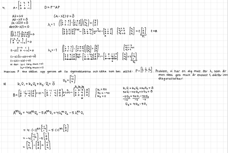 Det verkar som jag strular till det när jag gör min linjär kombination. Aldrig varit bra på det, men i facit så multiplicerar dem egenvektorn med -2 vilket jag inte gjort. Detta borde väl inte göra så jag får fel svar dock eller måste jag göra det? Verkar som att jag gjort rätt annars.