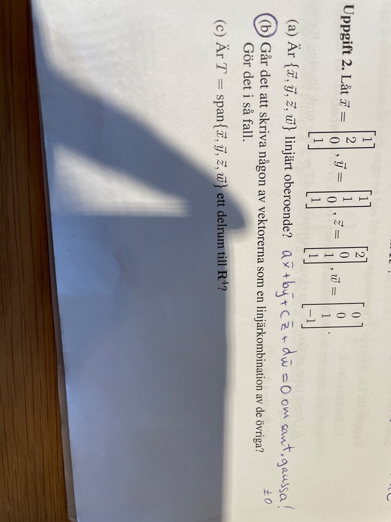 Du har ju räknat fram att mängden är linjärt beroende. Nu måste du tänka på vad det innebär. Per definition måste alltså minst en av vektorerna kunna linjärkombineras av de övriga. Om du har ställt upp en matris och gaussat (som du skrivit på pappret) kan du se att pivotkolumnerna är de oberoende vektorerna och den sista kolumnen är den som går att få genom linjärkombination med de övriga.