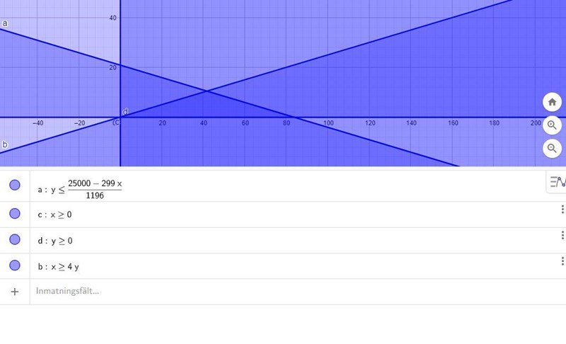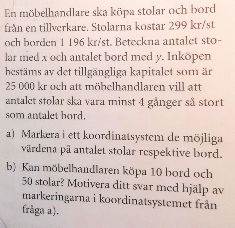 Du har ritat in x4yx\ge4y, men i uppgiften står det 4xy4x\ge y. Du har alltså planerat att köpa minst 4 ggr så många bord som stolar ;-).
