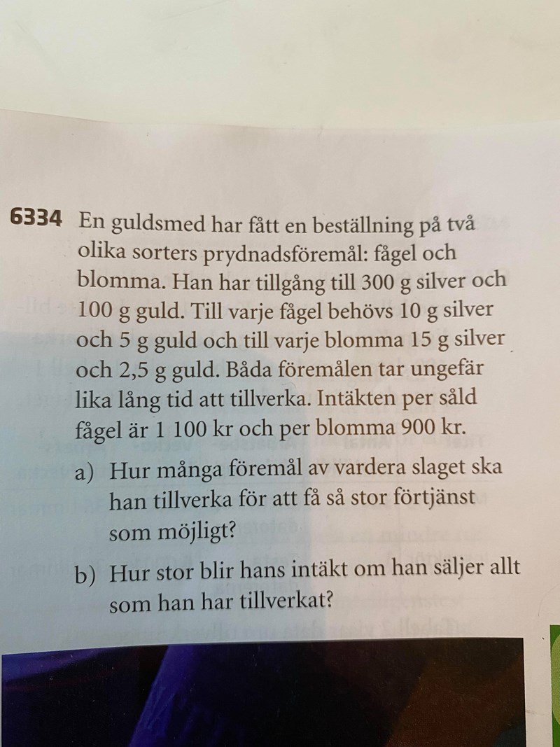 Sen tänkte jag skriva ner systemet av olikheter men kommer inte längre än y>_0, x>_0 och x+y<_400, om det nu ens stämmer. Hur går jag vidare? Har svårt att skilja på om silver och guld är x och y eller om x och y är är blomma och fågel? Visst fattas det en olikhet?