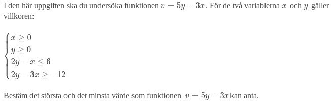 som uppfyller olikheterna  2y – x ≤ 6   och   2y – 3x ≥ -12
