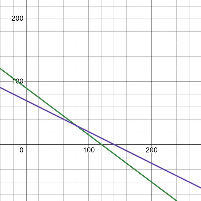 Om du bara går in i Desmos och skriver in 90-.75x på en rad son 70-.5x på en rad får du det hr ädiagrammet: