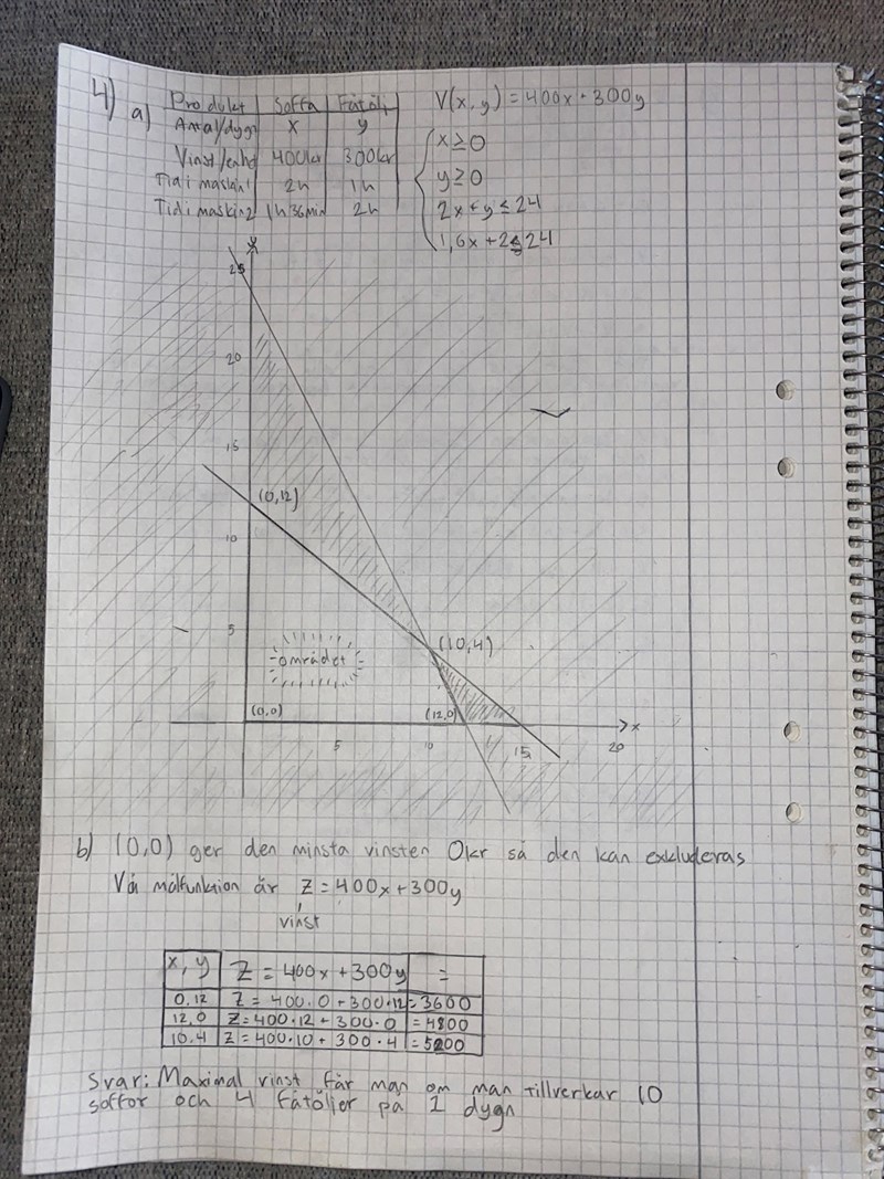 Jag vill ju ta reda på vinsten på ett dygn, så då produceras x antal soffor på 3,6 timmar inom ett dygn, och y antal fåtöljer på 3 timmar inom ett dygn. Eller tänker jag fel?