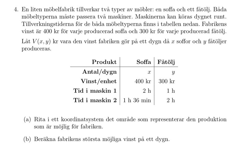 2 timmar per soffa i maskin 1+1 timme per fåtölj i maskin 1 får ta upp till 24 timmar att produceras, respektive 1,6 timmar per soffa i maskin 2+2 timmar per fåtölj i maskin 2 får ta upp till 24 timmar att produceras?