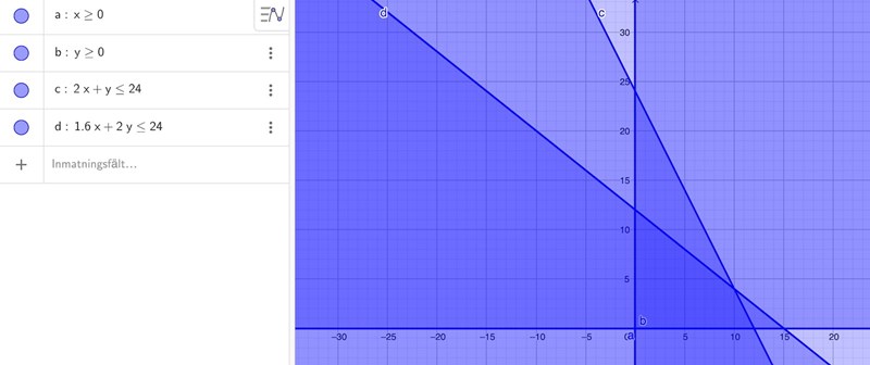 Har jag gjort rätt eller tänker jag fel? Och isåfall vad är nästa steg nu? Ställer jag upp dessa villkor i Geogebra får jag fram ett område men det känns inte helt korrekt. Snälla vägled mig!