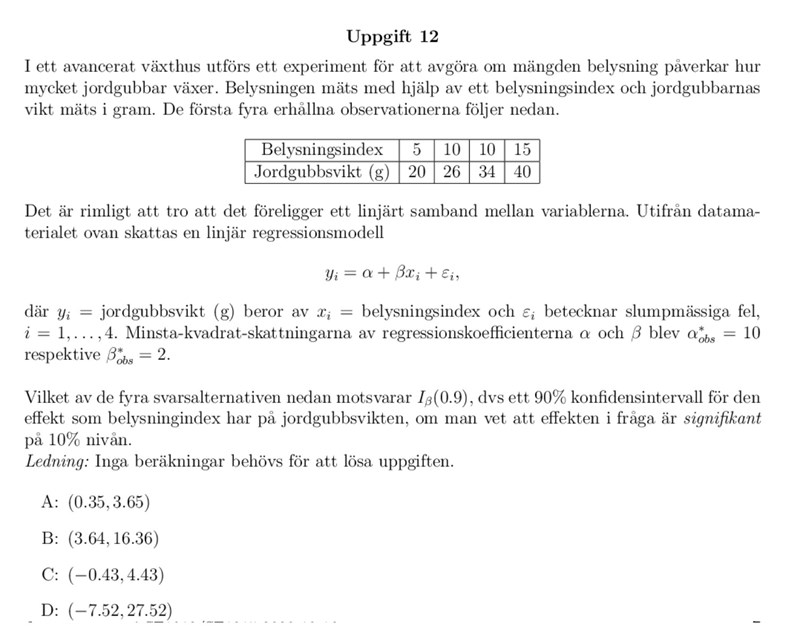 2) Effekten är signifikant, vilket betyder att 0 inte ingår i intervallet (om 0 ingår så kan vi inte säga att det är otroligt att parametern faktiskt är 0, och därmed spelar belysningen ingen roll, så effekten är insignifikant). Så då går även C bort (D uppfyller inte detta heller).