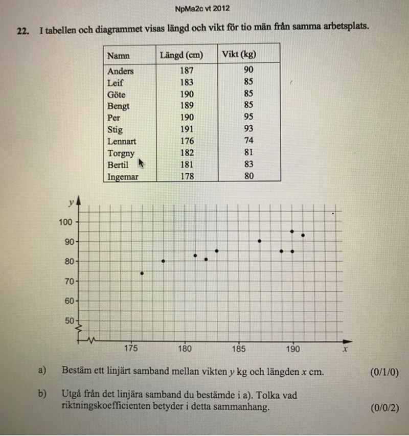 på B uppgiften skulle jag säga att k värdet bestämmer sambandet mellan vikten och längden... Men mer vet jag inte. Vad för samband går det att se av k värdet 0,993? Att vikten minskar med 0,7% per centimeter.? Hur ska man tänka?