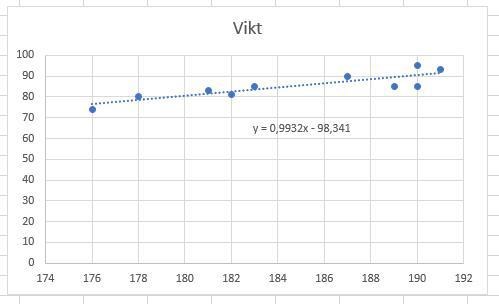 och man sedan jämför med y=89 får man att x~ 194,5 cm. skillnaden i vikt är cirka 1 cm. Så för varje ökade vikt i kg så ökar längden lika mycket.