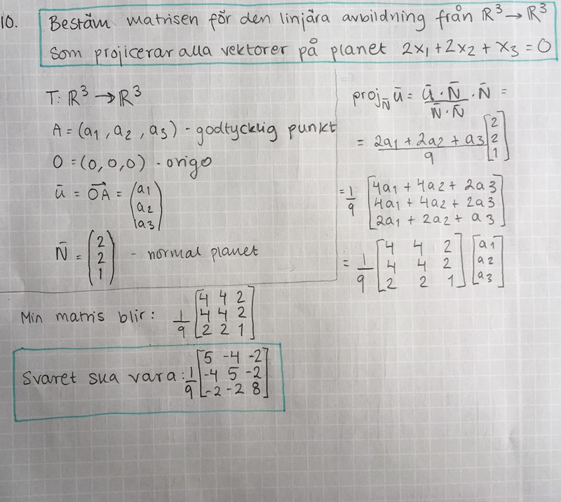 Skulle behöva hjälp med frågan: "Bestäm matrisen för den linjära avbildning från R^3-->R^3 som projicerar alla vektorer på planet 2x1+2x2+x3=0". Har gjort såhär men det blir fel enligt facit. Det som är inringat i blått är det rätta svaret.