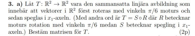 Jag antog först att S o R, är sammansatt funktion (s "boll" g) men i lösningsförslagen multiplicerade de endast matriserna med varandra för att få ut T, har jag missat något där? Så uttrycks de varken i vår bok eller på min mattelärares lektioner så jag är lite förvirrad. Sedan betecknar de R (moturs rotation) med en matris med cosinus och sinusvärden med x som pi/6, med varierande +-, och jag förstår inte heller hur de fick ut denna.