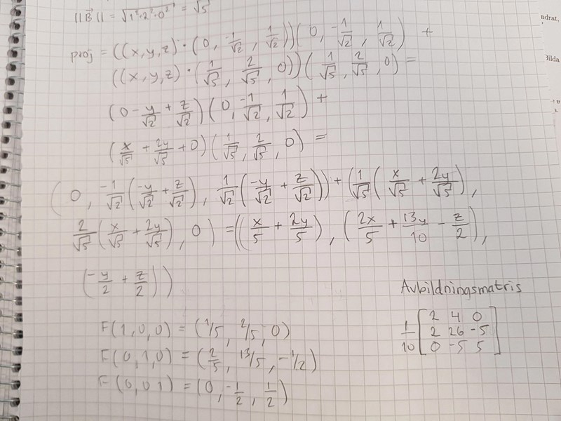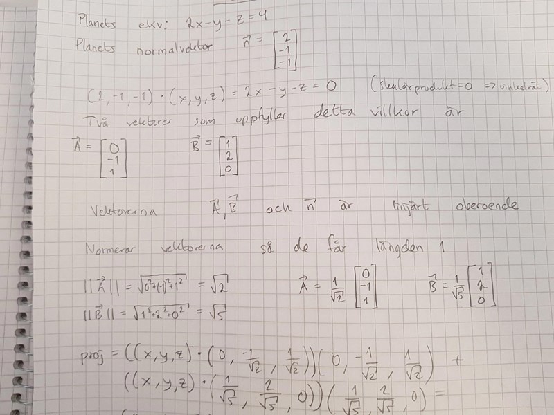 Har följande uppgift: Bestäm en avbildningsmatris för den linjära avbildningen som projicerar rummets vektorer på planet 2x-y-z=4