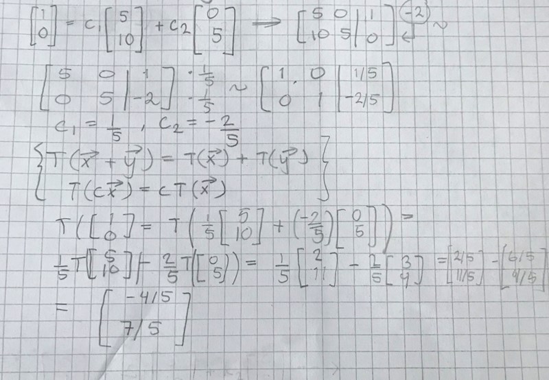 T([5,0]) = T([5,10]) - 2T([0,5]) = [2,11] -2[3,4] = [-4,3]