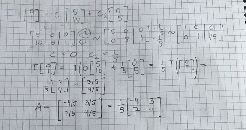 En variant för att lösa den här typen av uppgifter är att ta fram avbildningarna av basvektorerna. Vad blir T([0,1]) och T([1,0])?