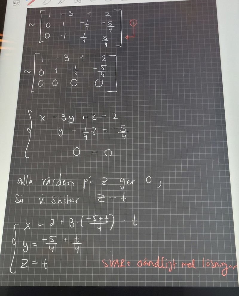 Det är ekvivalent med vad du fick. Om du byter ut -5/4 + t/4 (dvs y) mot en ny parameter, t.ex. b, så blir uttrycket likadant som i facit (fast med b istället för t).