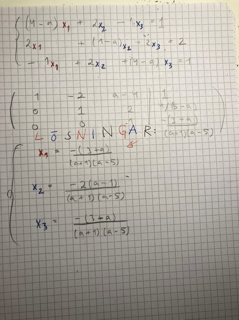 beerger skrev:Det stämmer! Men har du provat lösa totalmatrisen när du stoppar in a = -1 eller a = 5? Eller gissar du bara på att de inte har några lösningar då?